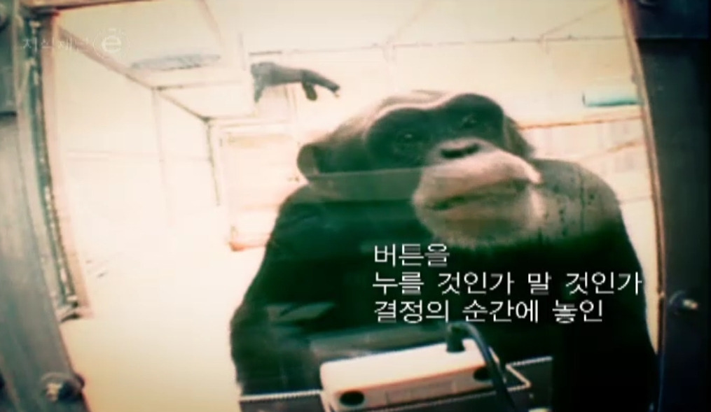 버튼을 누르는 사람 옆에는 "계속 하세요, 죽지 않아요, 우리가 다 책임집니다." 라고 말하는 흰색 실험복 입은 권위자가 있었고 버튼을 누르는 원숭이 옆에는 아무도 없었다.