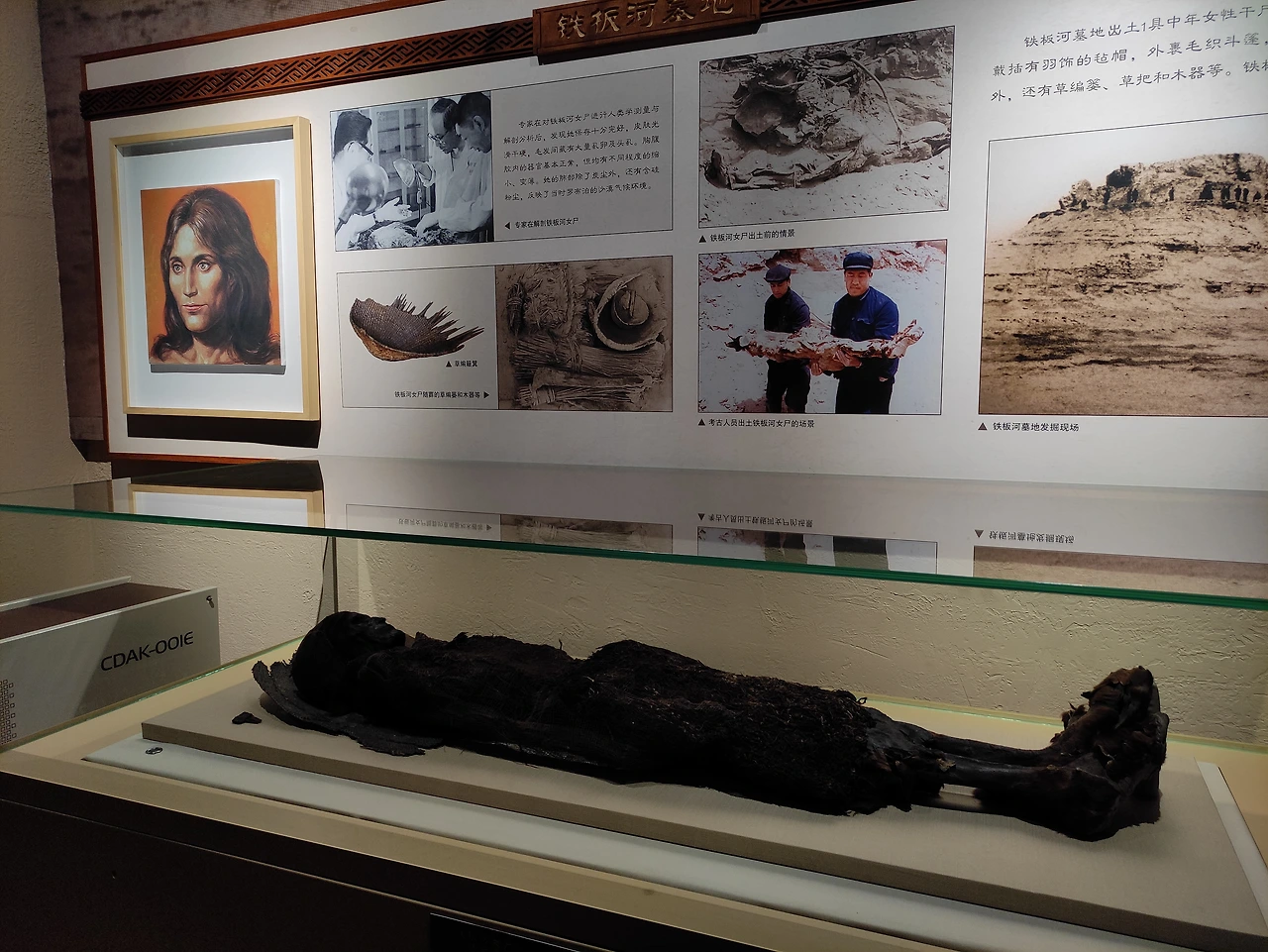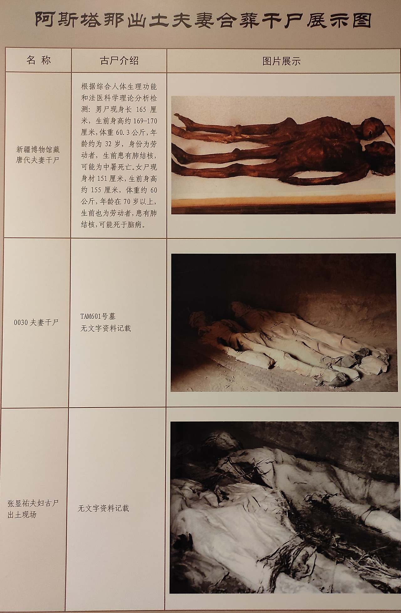 노동자 계급의 묘이므로, 고고학적 가치가 있는 부장품이나 문서는 발견되지 않은 듯했다. 그래서 실물 미라 대신 사진만 전시되어 있었다. 발굴 당시의 사진을 봐도, '소하공주' 미라나, '속눈썹 긴 미녀' 미라 등과는 달리, 뒤집어진 배 모양 관도, 가면이나 깃털 등의 장식품도 없이 그저 소박한 수의를 입은 부부 모래 바닥 위에 나란히 누워있다. 30대 초반의 남편이, 투르판의 살인적인 더위(여름철 평균 기온 40도) 속에 일하다 먼저 죽었다. 그 후 40년이 흘러, 남편 없이 혼자 아이들을 키우며 노동으로 생계를 이어오던 아내도 어느덧 할머니가 되어 청년으로 죽은 남편 곁에 묻혔다.
