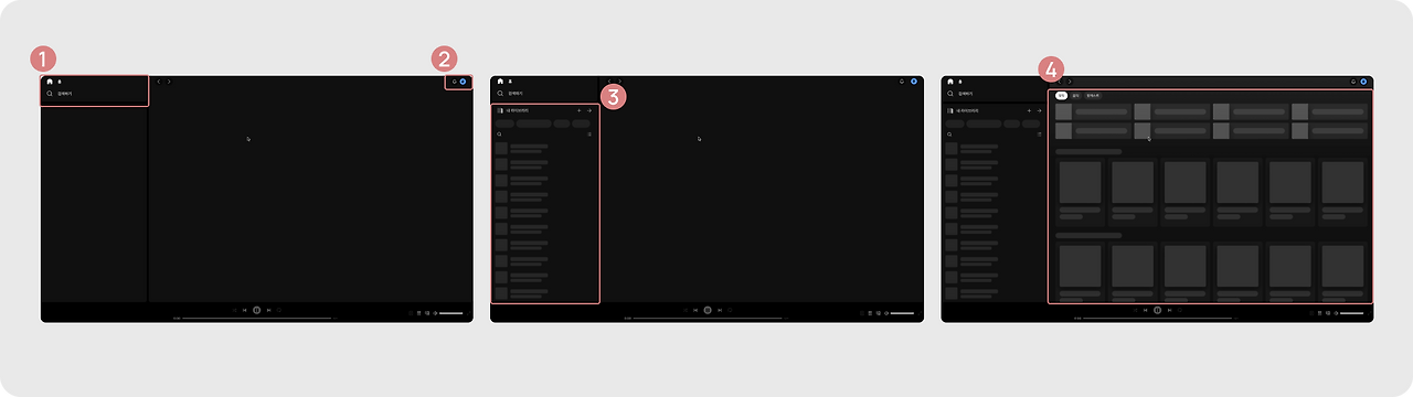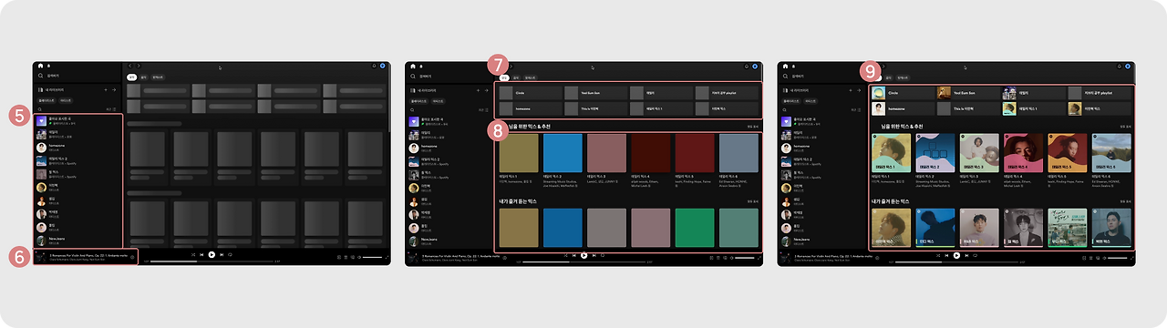 5,6번 : 내 라이브러리 리스트 및 플레이어 영역의 재생 중인 음악 타이틀이 보인다.