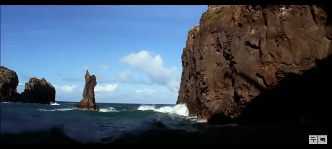 세찬 파도 밑엔 식인 상어 떼, 뭉게구름 아래 푸른 야자수.