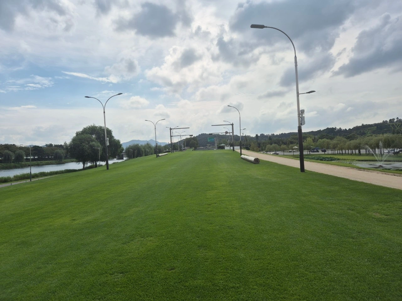 비 머금은 잔디는 짙은 초록빛을 띠고,