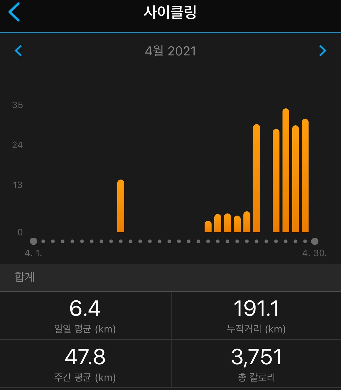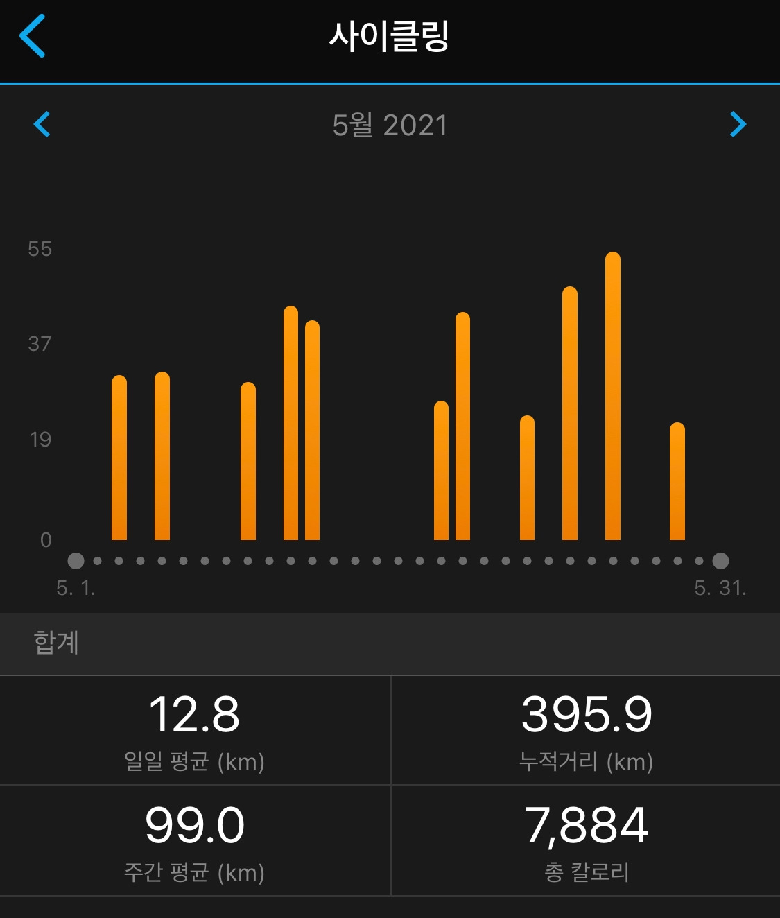 4,5월 사이클링 기록을 확인해 보니 누적거리가 587km이었다. 4월 중순부터 5월 말까지, 총 6주를 탔으니까 일주일에 적어도 100km는 자전거를 탔다고 할 수 있다.