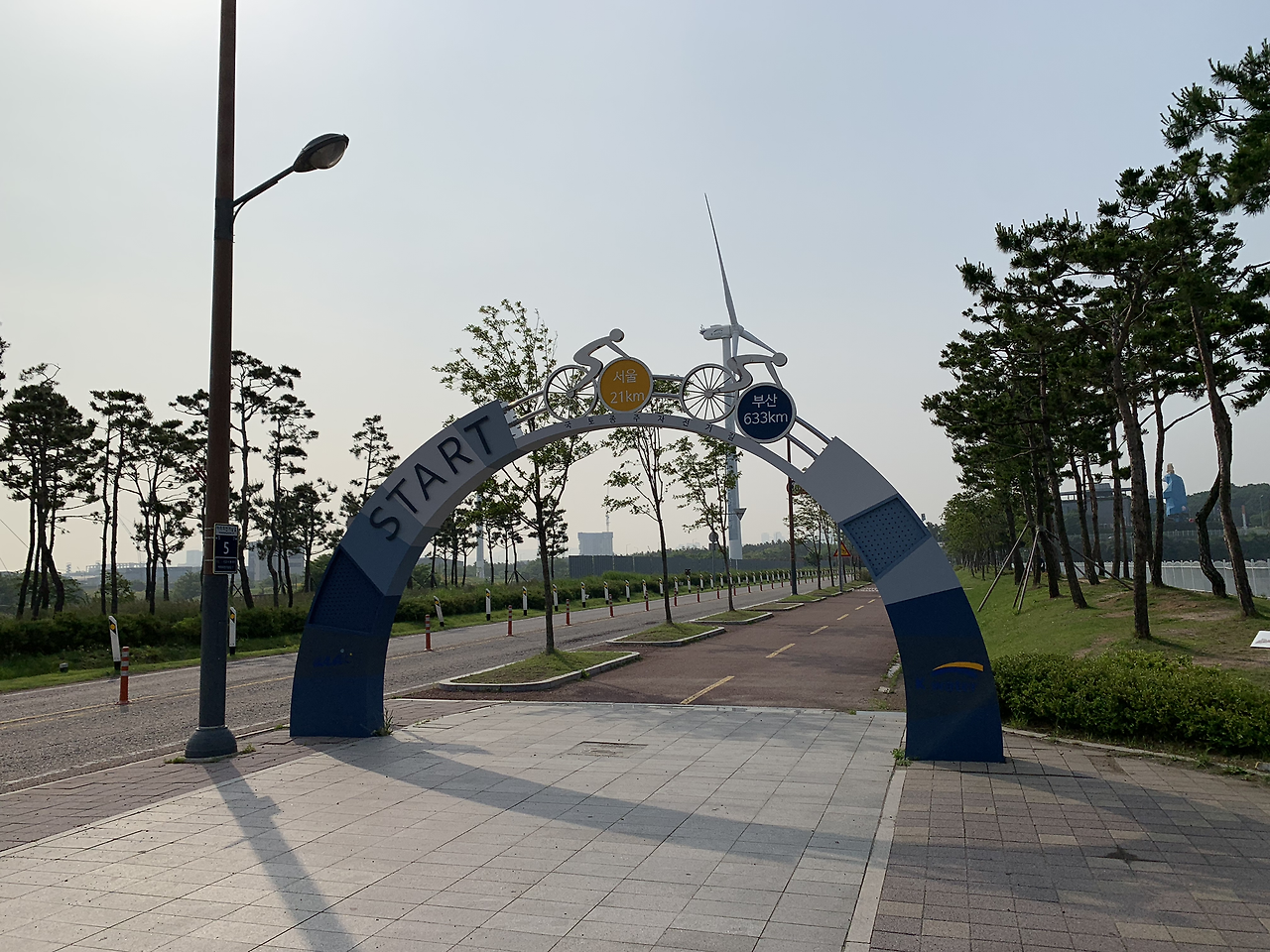 그러나 나의 기대와 달리 아라서해갑문 인증센터에 도착한 시간은 8시 10분이었다. 중간에 길을 잃고 잠시 헤매는 바람에 예상보다 40분이 더 걸렸다. 방화대교 남단에서 경인 아라뱃길로 가려면 김포터미널 물류단지를 통과해야 한다. 물류단지 안에 자전거길 표시가 있지만, 길이 여러 개라서 헷갈렸다.