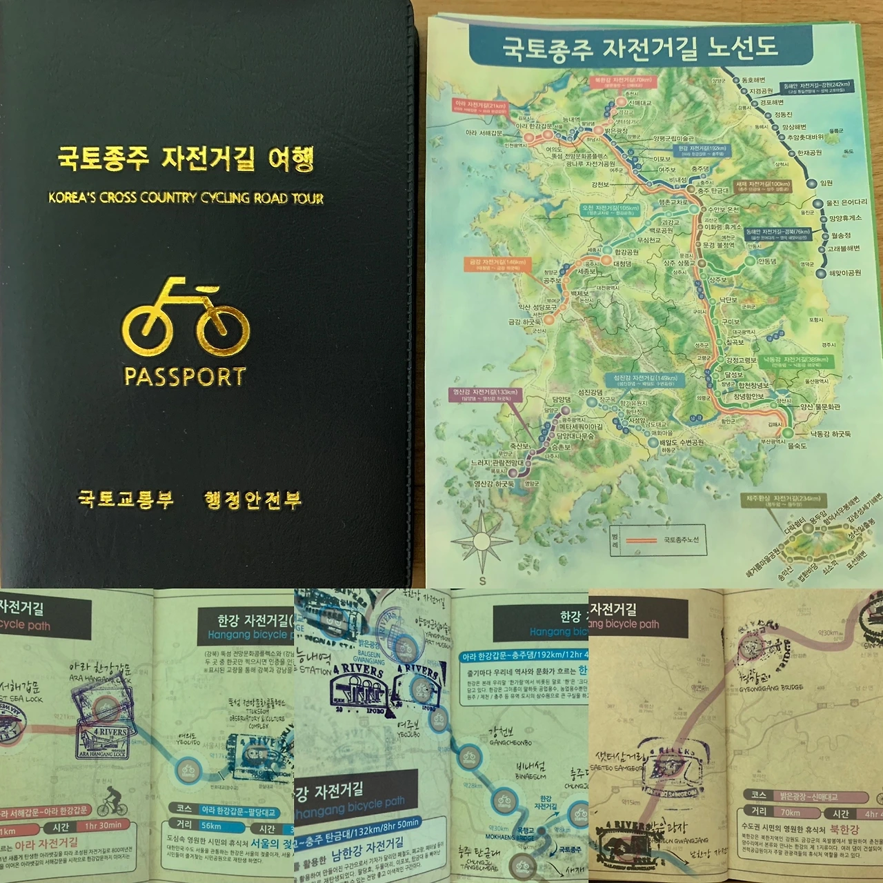 "이번에는 어디를 가볼까?" 혼자 고민하며 장소를 몰색하고 있을 때 남편이 "이런 것도 있네요." 하며 '국토종주 자전거길 노선도'와 '수첩'을 보여 주었다. '국토종주 자전거길 노선도'는 전국에 있는 자전거길을 한눈에 보여주는 지도다. '국토종주 자전거길 종주 인증 수첩'을 사서 각 코스의 인증센터에 비치된 스탬프를 모두 찍으면 인증센터에서 확인 후 인증 스티커와 인증서, 인증메달, 인증서 케이스를 받을 수 있다(스티커, 인증서, 메달, 케이스 비용은 개인이 부담).