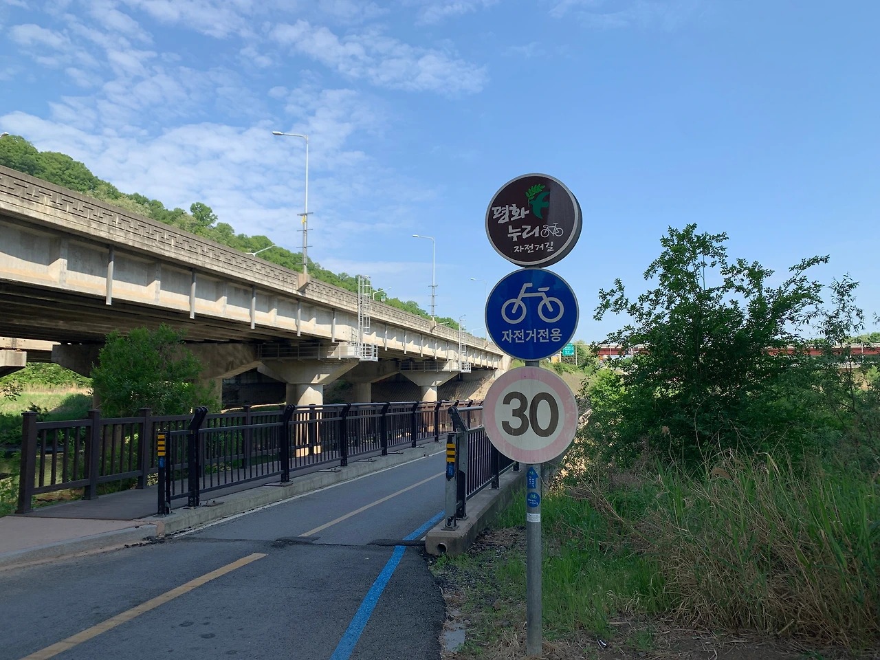 파주 평화누리 자전거길 3코스는 창릉천 합수부(창릉천과 한강이 만나는 지점)에서 시작된다. 도로 위에 그려진 파란선과 가로등에 걸린 '평화누리 자전거길'이라는 표지판과 화살표만 잘 보고 따라가면 길을 잃을 염려는 없다. 생각보다 공도구간이 많지만 자동차 통행량이 많지 않아서 나같은 초보도 안심하고 달릴 수 있다. 다만 자전거길이 끝나는 내포3리에서 문산 임월교 교차로까지, 2km 정도의 공도 구간은 공사중이라서 주의를 기울여서 달려야 한다. 차들의 통행량이 많지 않지만 덤프차가 자주 다녀서 무서웠다. 공사가 하루 빨리 끝났으면 좋겠다.