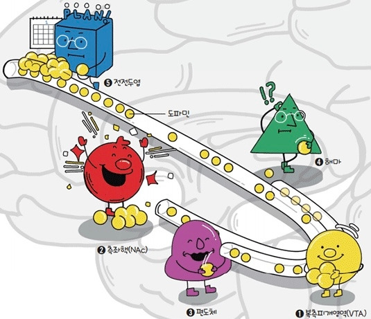 어떤 행동을 계속하도록 유도하는 시스템을 ‘보상회로‘라고 부른다. 여기에 관여하는 뇌의 영역에는 5개가 있다(아래 그림 참조)
