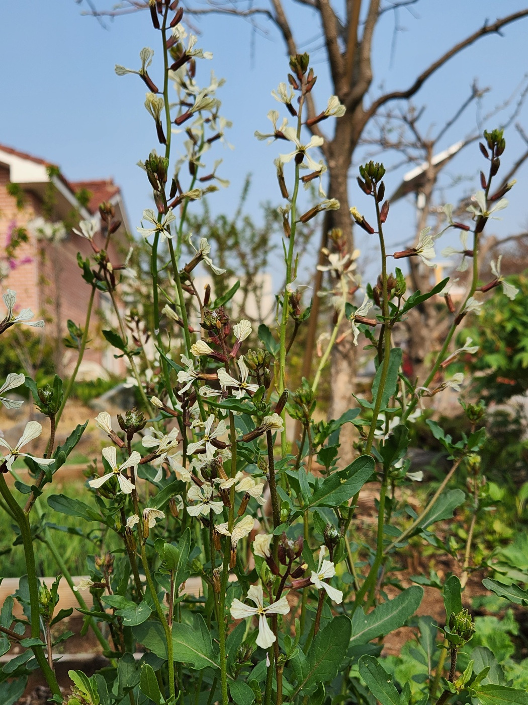 위의 이 꽃은 루꼴라라는 꽃이다. 루꼴라의 특이한 향을 싫어하는 사람도 많지만 우리식구들은 좋아한다. 그래서 항상 루꼴라와 고수는 텃밭에서 늘 항상 자라고 있고 일부 먹다가 그대로 두면 저렇게 화려한 꽃을 보여준다. 오늘도 이쁘다 이쁘다를 소곤거려 주었다.