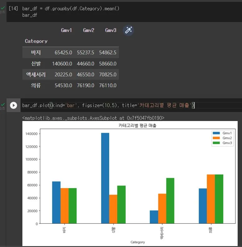 예시에서는 각 카테고리별 gmv 값의 평균을 구한 후 바형으로 나타냈습니다.