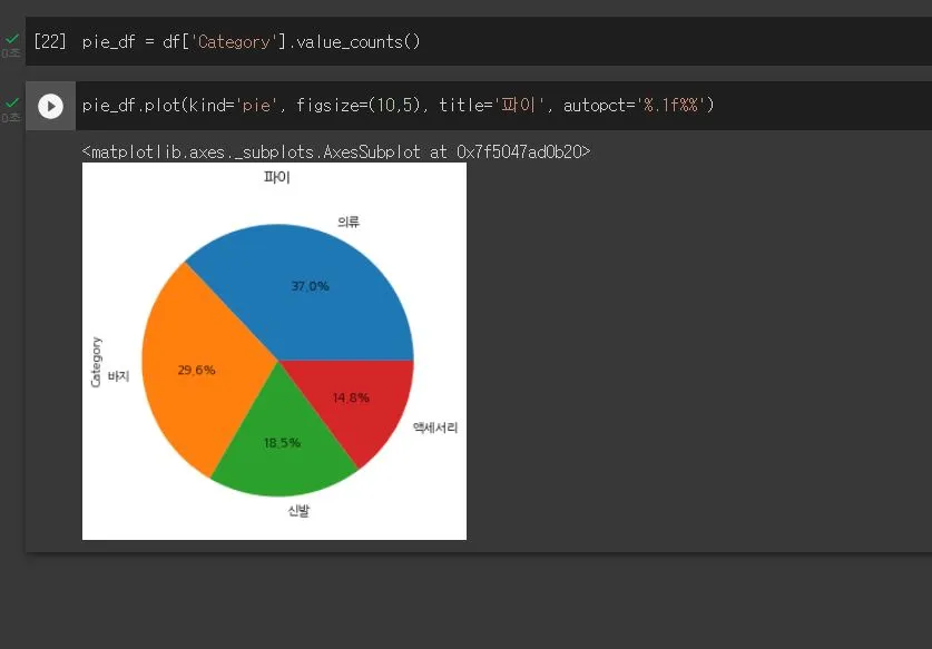 먼저 파이형으로 나타낼 컬럼을 pie.df = df['category'].value.counts()를 통해 정의해준 후, 앞서 진행했던 식과 같이 plot 함수를 활용한 식을 입력해줍니다.