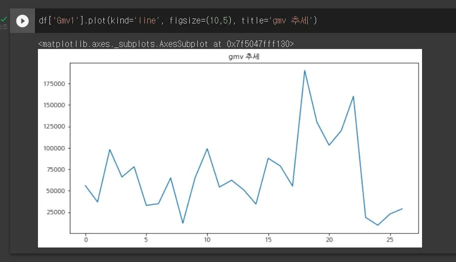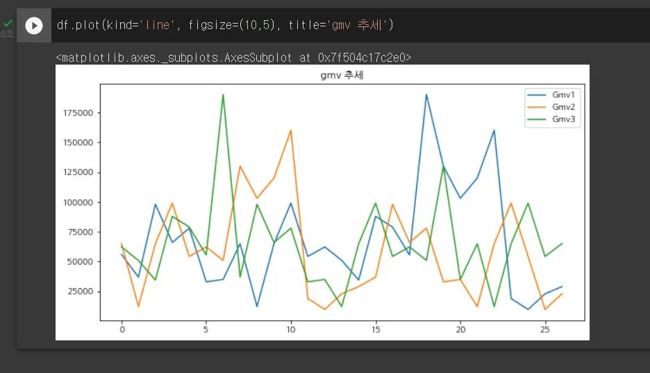 위의 예시에서는 df.plot(kind='line', figsize=(10,5), title='gmv 추세')를 출력하여 gmv 추세라는 제목을 가진 가로 10, 세로 5의 크기로 한 그래프가 들어갈 틀 및 라인형 그래프를 보여준 모습입니다.