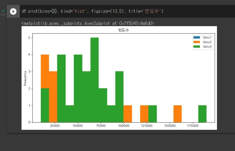 df.plot(kind='hist', figsize=(10,5), title='빈도수')를 출력하여 나타내었으며, 추가로 간격을 의미하는 bins=20을 입력하여 데이터 간의 간격을 넓혀 시각적으로 더욱 보기 좋게 구현했습니다.