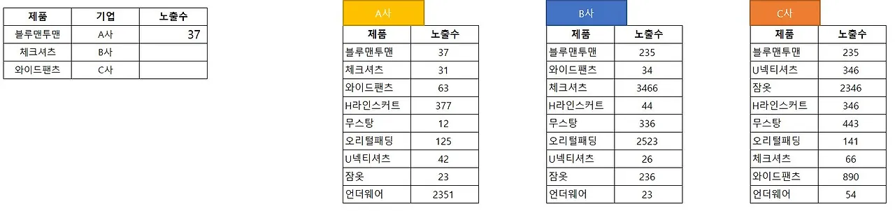 해당 예시도 통계자료 정렬이 세로로 되어있으므로 VLOOKUP을 사용함을 알 수 있다. 그런데 앞에서 진행했던 사례와 다르게 해당 예시는 범위가 A사, B사, C사로 구분되어 있다.