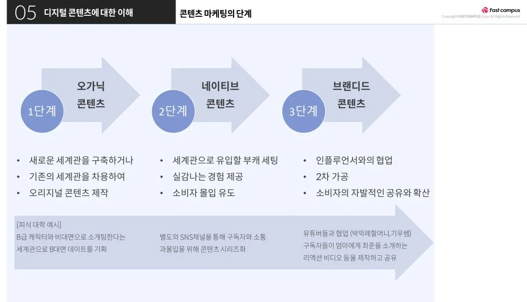 우리가 흔히 보는 콘텐츠 마케팅은 다음과 같은 단계로 구성된답니다. 오가닉 콘텐츠로 시작하여 실감나는 경험을 제공하는 네이티브 콘텐츠를 거쳐, 소비자의 자발적인 공유와 확산을 유도하는 브랜디드 콘텐츠까지 이어지는 구조예요.