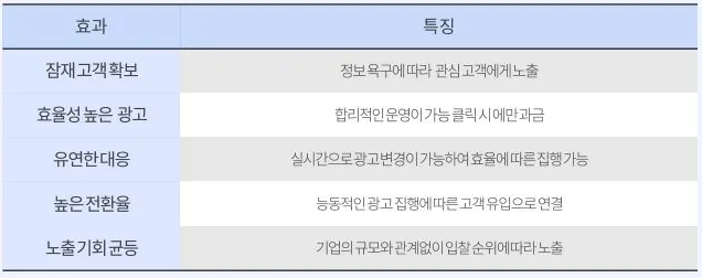 우리가 지금까지 살펴본 검색광고의 효과와 특징을 한눈에 요약하면 다음과 같아요. 특히, 합리적인 운영이 가능할 뿐만 아니라 실시간 광고 변경을 통해 유연한 대응이 가능하다는 점이 큰 메리트라 생각했어요.