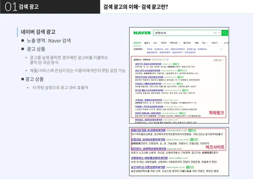 검색광고는 단연 네이버와 구글이 양대산맥이라고 말할 수 있어요. 먼저 네이버는 파워링크와 비즈사이트로 크게 나뉘는데, 파워링크를 전국단위로 그리고 비즈사이트를 지역단위로 생각하면 된답니다.