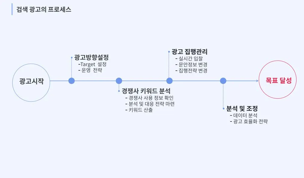검색 광고 프로세스 플로우를 도식화하면 다음과 같아요. 각 부분들이 목표에 달성하기 위해 모두 필요하겠지만, 특히 꼼꼼한 경쟁사 키워드 분석이 필요하다고 생각해요.