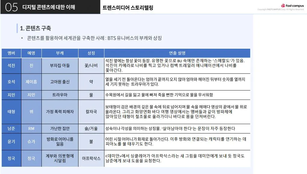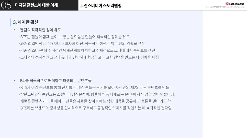 이뿐만 아니라 이번 강의를 통해 BTS의 트랜스미디어 스토리텔링 전략을 통한 셰계관 구축 및 브랜딩이 그들의 성공열쇠 중 핵심적인 부분이었다는 걸 알게 되었어요.
