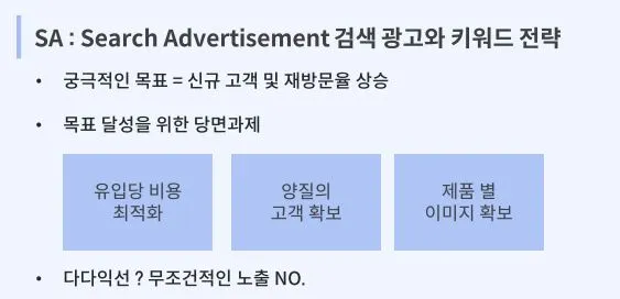 검색광고는 키워드 전략이 매우 중요해요. 신규 고객 및 재방문율 상승이라는 목표를 달성하기 위해 무조건적인 노출보다는 비용을 고려하여 광고비 대비 매출액을 뜻하는 ROAS를 최적화할 필요가 있어요.