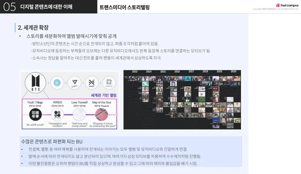BTS는 자신들만의 공고한 세계관을 구축하여 스토리를 파편화했어요. 이러한 부분이 총체적인 세계관을 이해하기 위해 확인해야 하는 콘텐츠의 수명을 길게 만들었고, 스토리 전개를 긴밀하게 만들었어요.