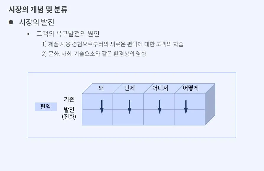 관찰하고 분석하여 영원한 정답이 나오면 좋겠지만 시장은 계속해서 변화합니다. 바로 고객의 욕구 발전이 주된 원인입니다. 즉, 빠른 주기로 바뀌는 우리 주위 환경의 영향으로 시장의 발전이 이루어지고 있어요.