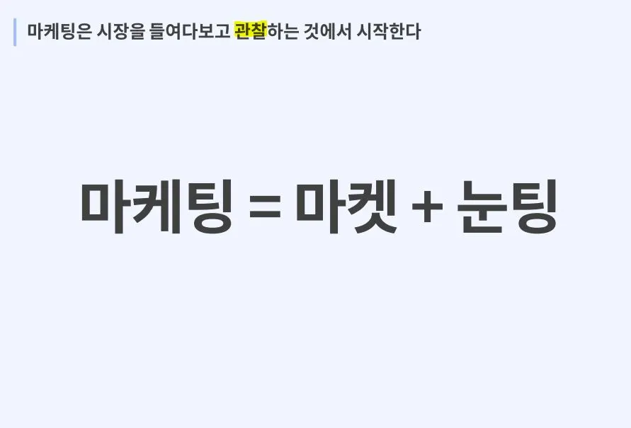 마케팅의 기본은 시장에 대한 관심과 관찰로부터 시작해요. 강의에서는 '마켓+눈팅'이라는 신선한 표현으로 마케팅을 수식했어요.