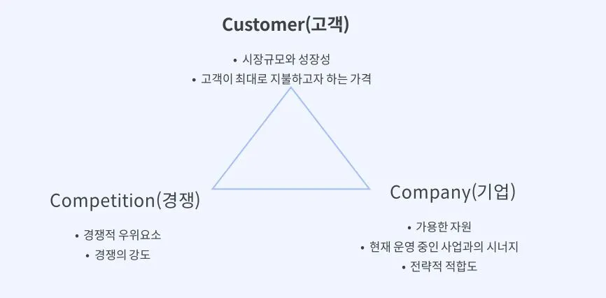 시장은 3C라고 하는 고객, 경쟁, 기업을 고려해야 합니다. 처음에 저는 세 부분 모두 중요하여 의사결정 때마다 전부를 고려해야 하는 것으로 이해했습니다.