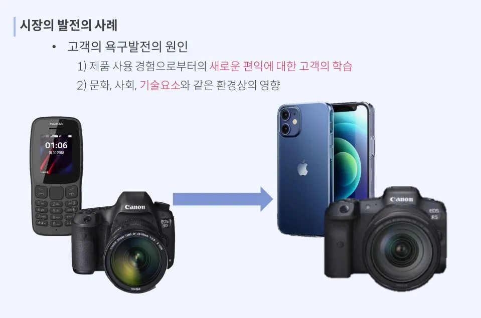 시장 발전의 또 다른 예시는 카메라가 있어요. 아마 대부분이 공감하실 거라 생각해요. 사진을 찍는 카메라라고 하면 예전엔 캐논이 먼저 생각났었는데, 이제는 캐논 카메라보다 스마트폰을 먼저 꺼내는 세상이죠.