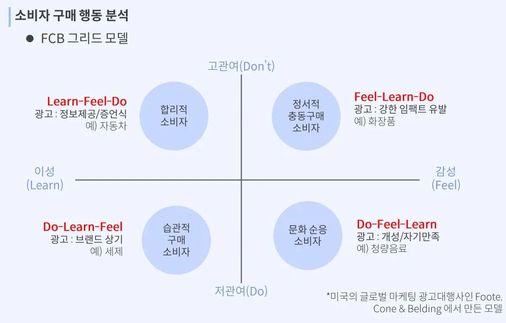 소비자의 구매 행동에 영향을 미치는 3가지 요소는 학습, 감정, 행동이에요. 이를 활용하여 위와 같이 FCB 그리드 모델을 도식화할 수 있어요.
