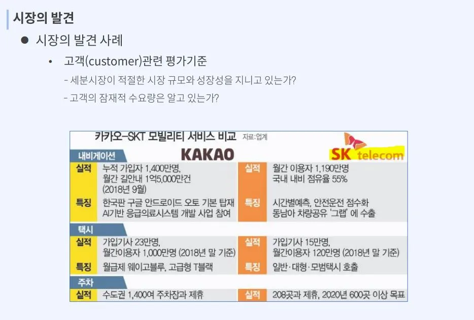 시장의 발견 사례로 카카오와 SK의 예시를 들어주셨어요. 카카오는 이미 누구나 알고 있는 모빌리티 시장의 강자로 거듭나 있었어요. 그러나 시간이 점점 지나면서 카카오는 일반 택시로 잘 잡히지 않는 등 문제가 조금씩 발생하기 시작했죠.