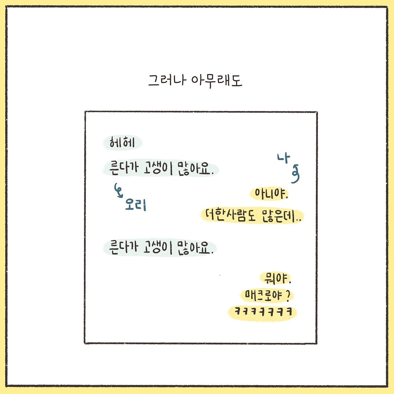 “고생이 많아요. 너한테 말해주는 거야. 다른 사람도 힘들겠지만 나는 너를 칭찬하는 거야.”