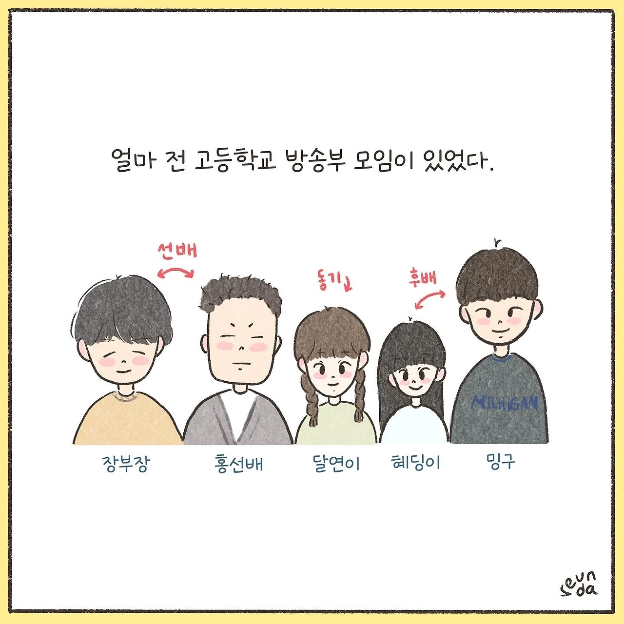 감사한 기억이 가득한 방송부 이야기를 만화로 풀어보고 싶은데 시작이 어렵다. 오래간만에 시간을 맞춰 가까스로 만난 이번 방송부 모임처럼 언젠가 나의 고등학교 이야기도 풀어갈 수 있겠지?