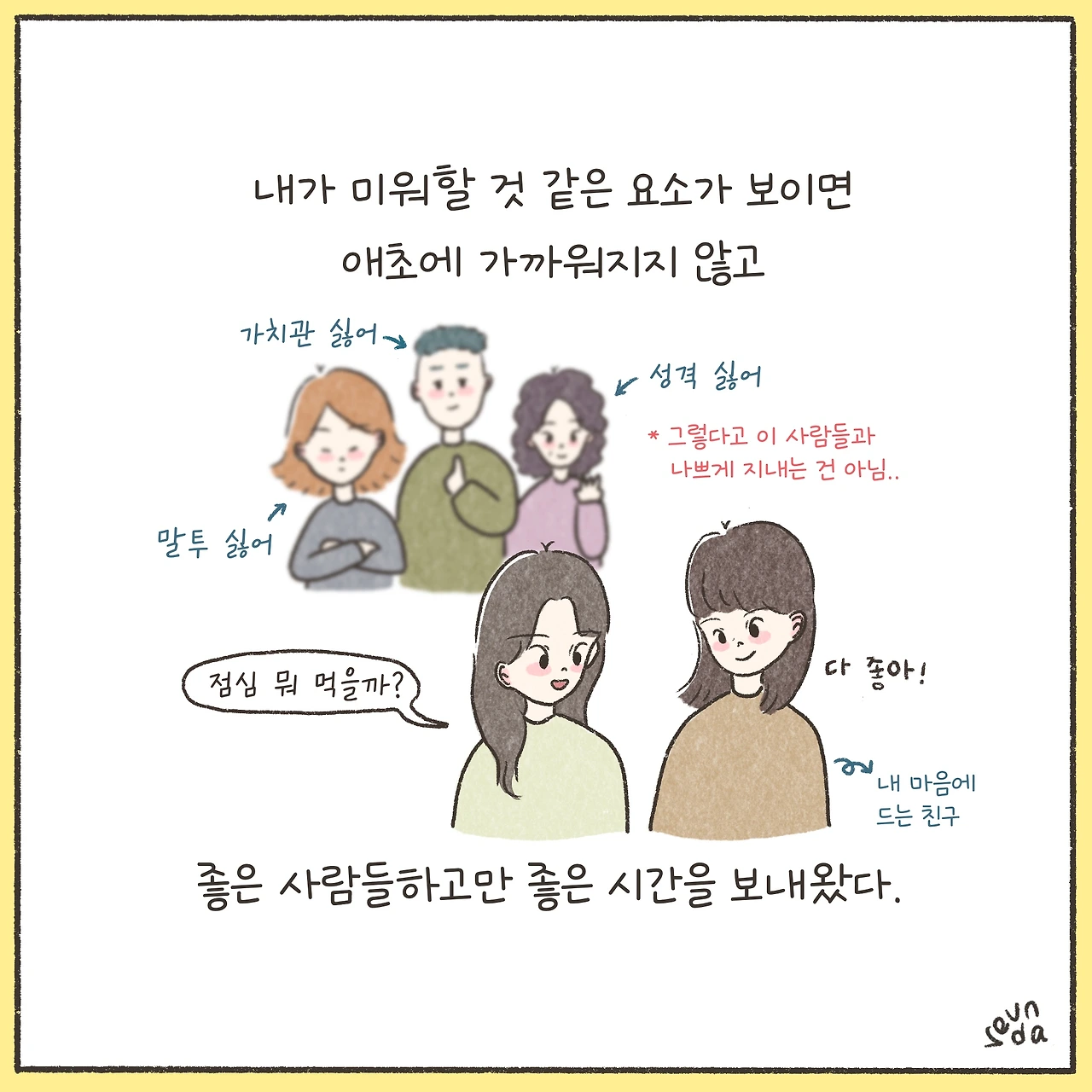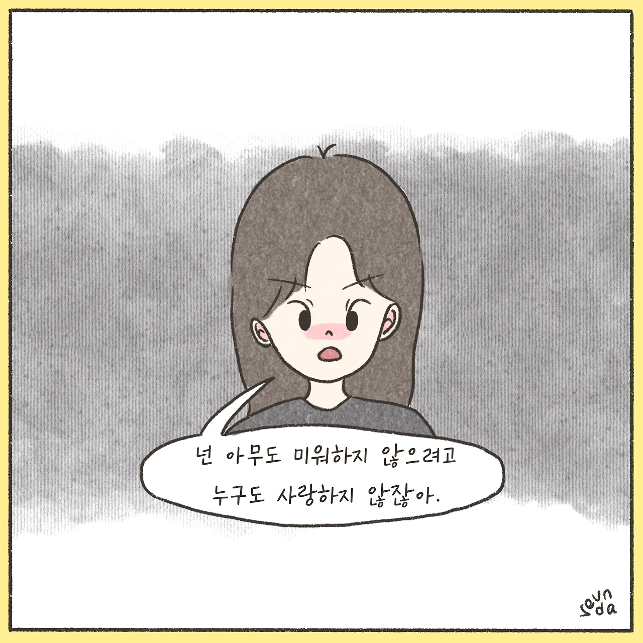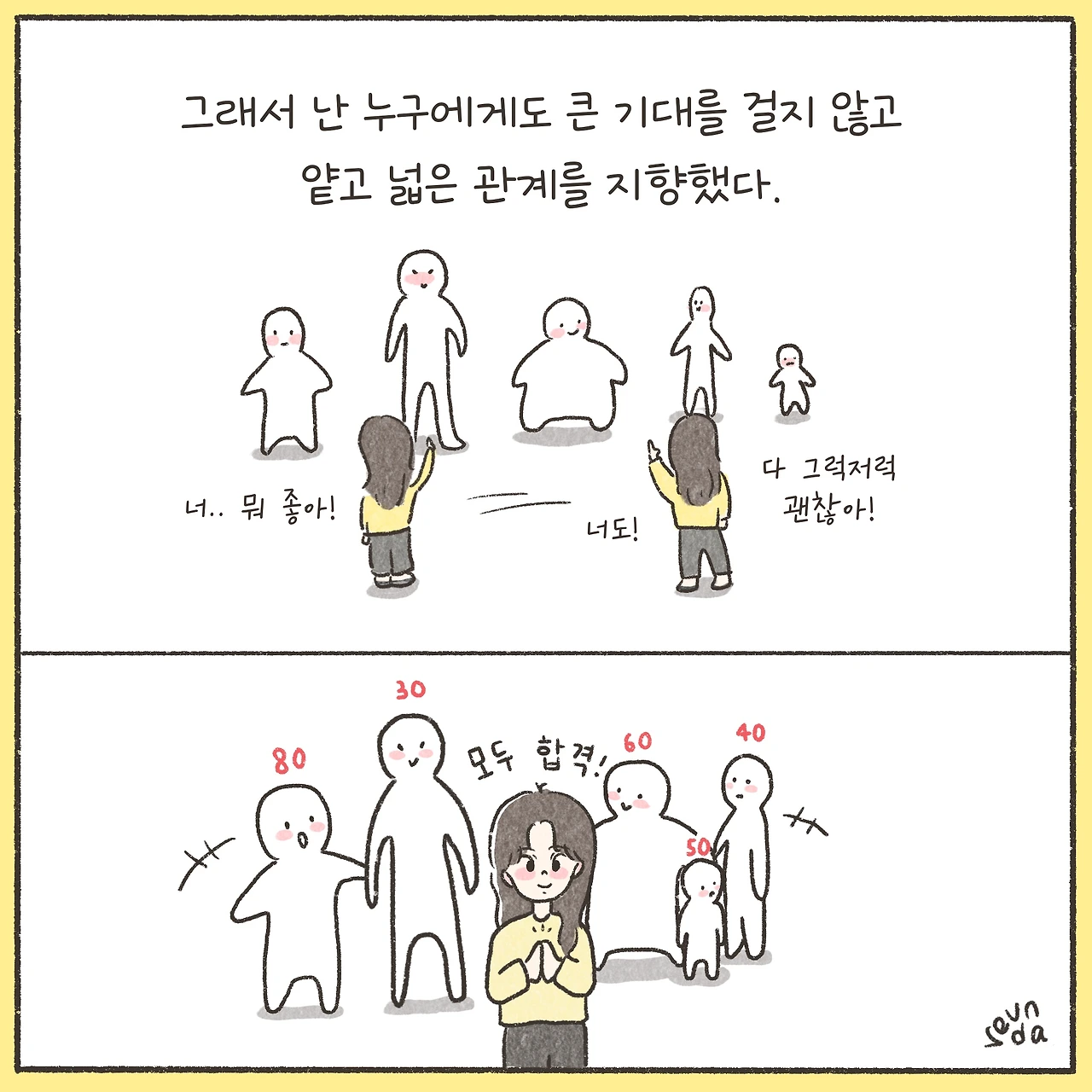 나는 여기에 그다지 공감하지 못했다. 남한테 크게 기대하지 않고 나와 부딪힐만한 사람인 것 같으면 애초에 접점을 만들지 않으려고 했다. 좋은 게 좋은 거라고 여겼고 누군가 나에게 가식적이라고 해도 "원래 적당히가 제일 좋아. 사람 사이엔 미학적 거리가 필요하다고."라며 미지근한 인간관계를 선호했다.