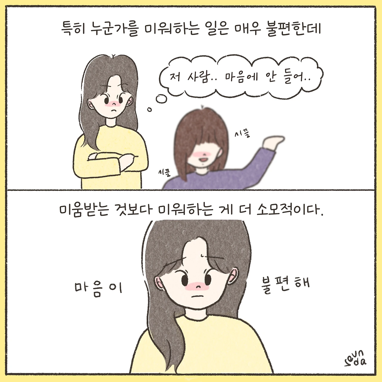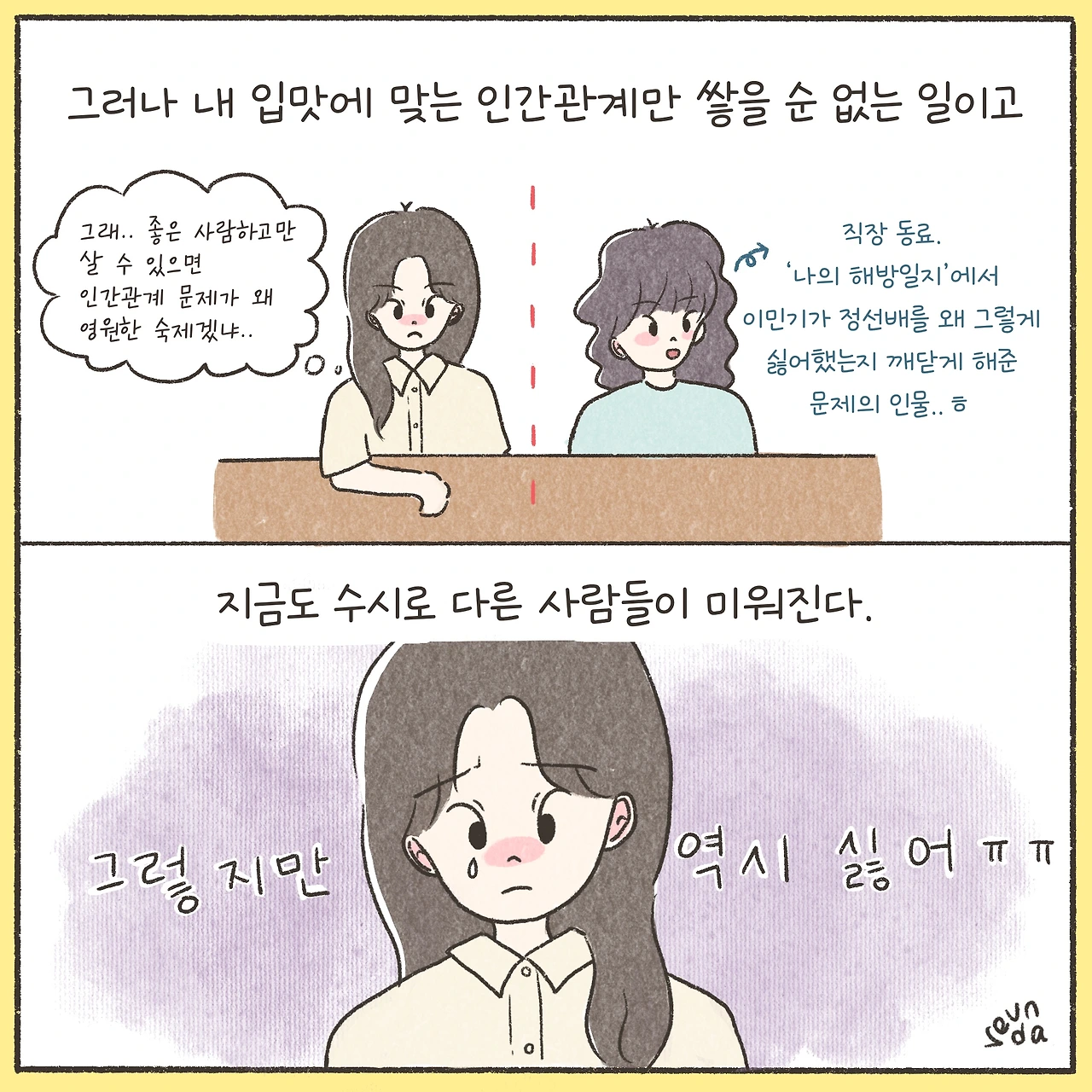 그러나 마음처럼 내 입맛대로 살 수만은 없는 것. 머리로는 알고 있었지만 내심 인간관계를 통제할 수 있다고 생각했다. 어쩔 수 없이 부딪혀야만 하는 사람들, 열심히 피해봐도 바람처럼 밀려드는 갈등들이 있다는 걸 꽤 늦게 알게 됐다. 아무리 도망간다고 해도 스트레스로부터 자유로울 순 없었고 '미움'이라는 감정은 생각보다 힘이 셌다.