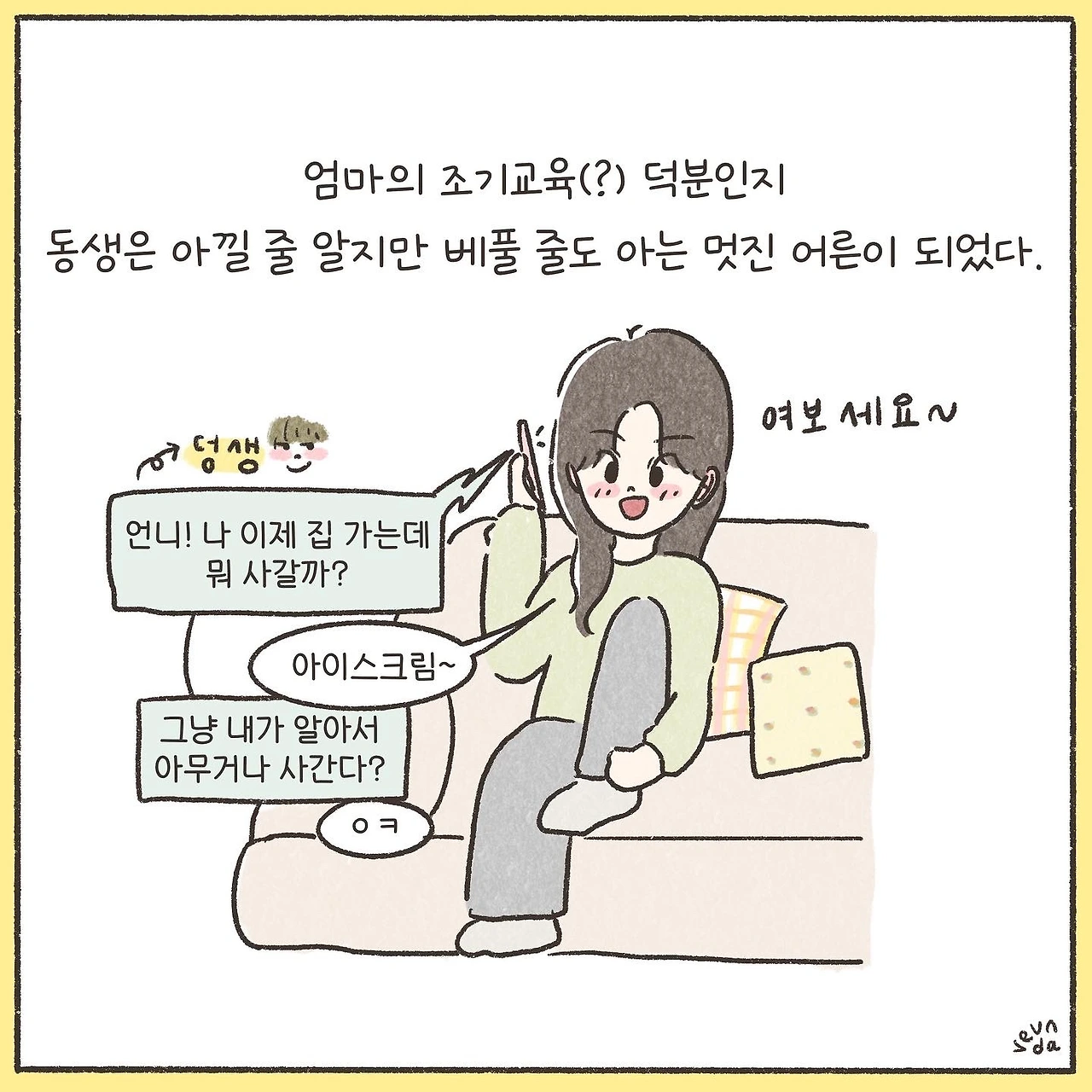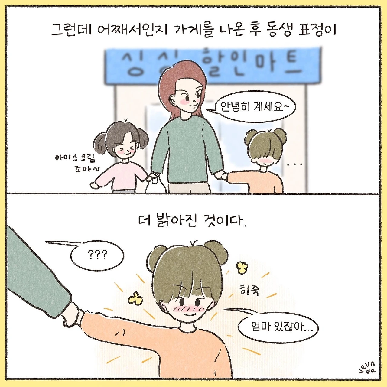 그렇게 어거지로 간 슈퍼에서 동생은 예상 밖의 행복을 얻었다. 우리는 아직 돈의 단위까지는 제대로 몰랐던 나이였고 그저 많이 있으면 더 좋은 건 줄 알았다. 자기는 분명 한 장을 주었는데 돌아오는 건 여러 장의 지폐와 동전이니 이게 무슨 횡재인가. 거스름돈을 양손 가득 받아들고 행복해하던 그 표정을 엄마는 아직도 잊을 수 없다고 한다.