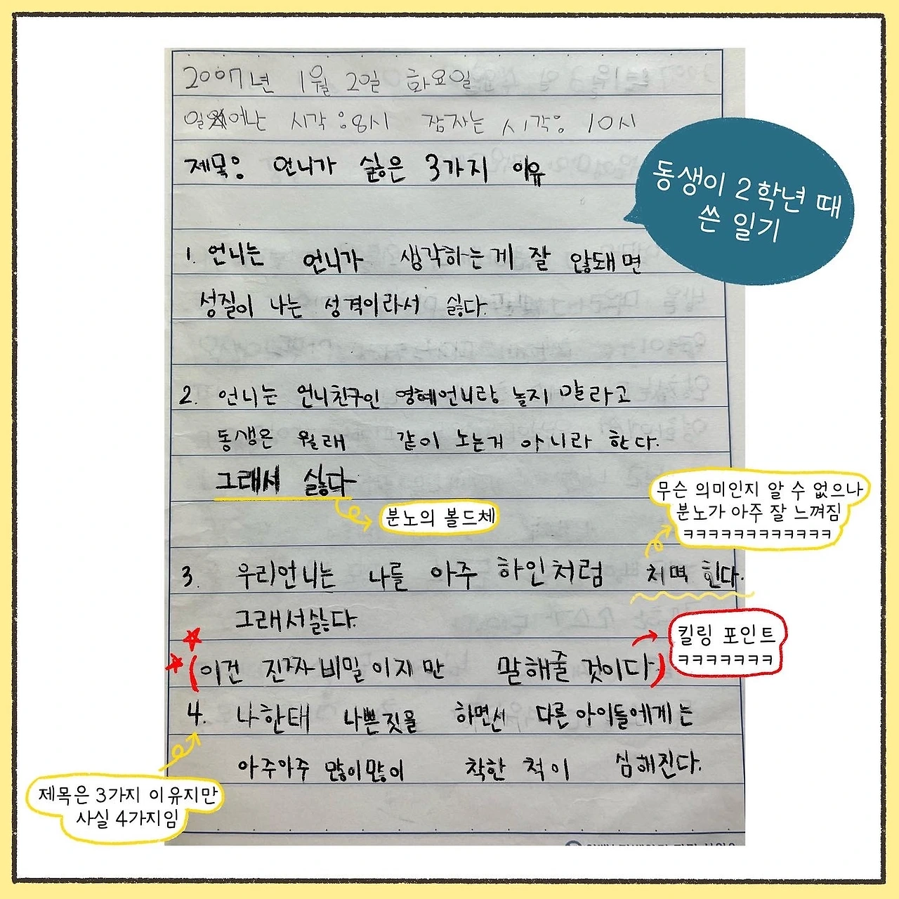 (+) 2학년 일기장 틈바구니에서 발견해 연도를 보지 않고 2학년이라고 표기했네요. 정확히 동생이 3학년 때 쓴 일기랍니다! 글씨를 너무 잘 써서 2학년 아닌 것 같다 해주신 분들 계신데, 정답이네요 하하. 다음부터는 자료를 참고할 때 더 신중할게요!