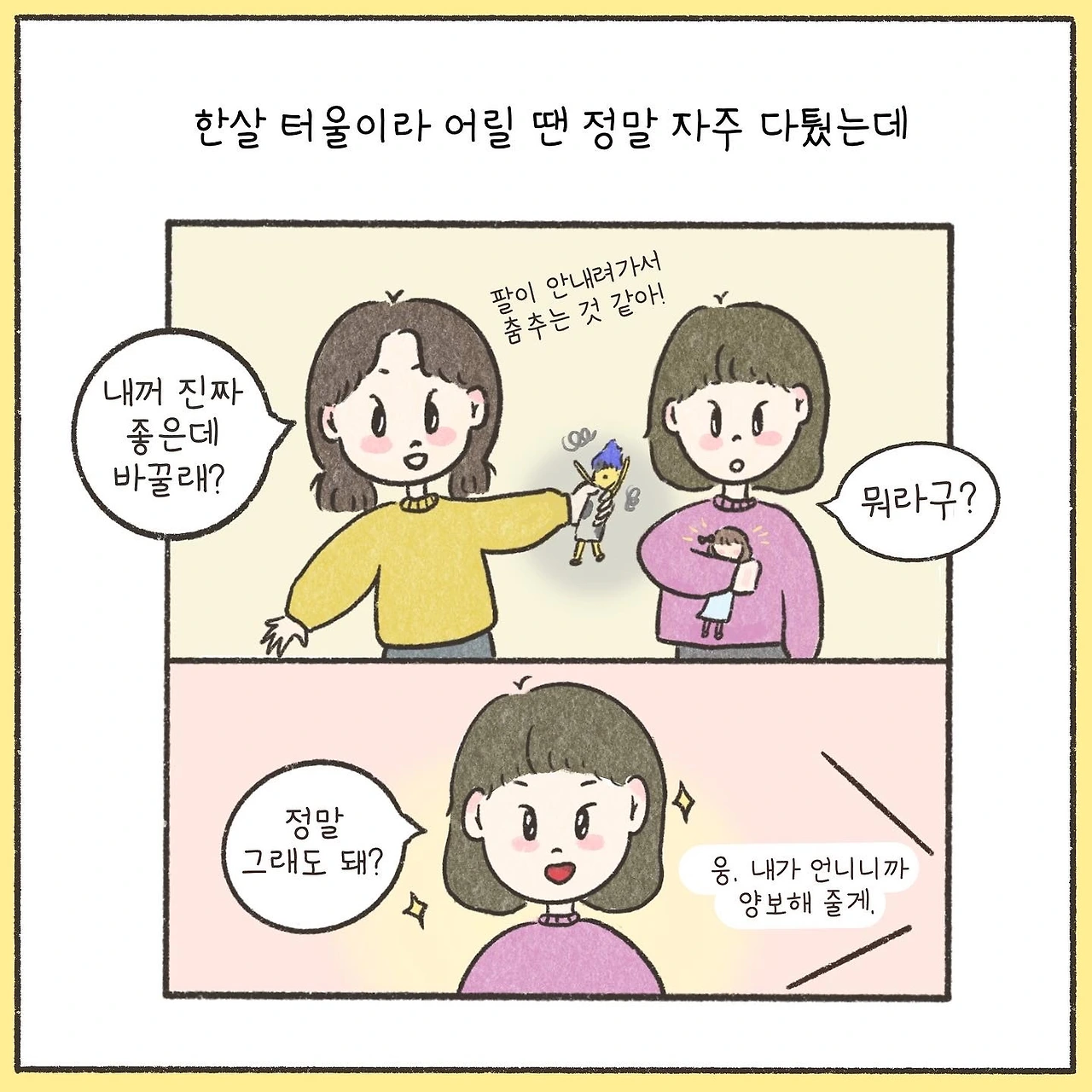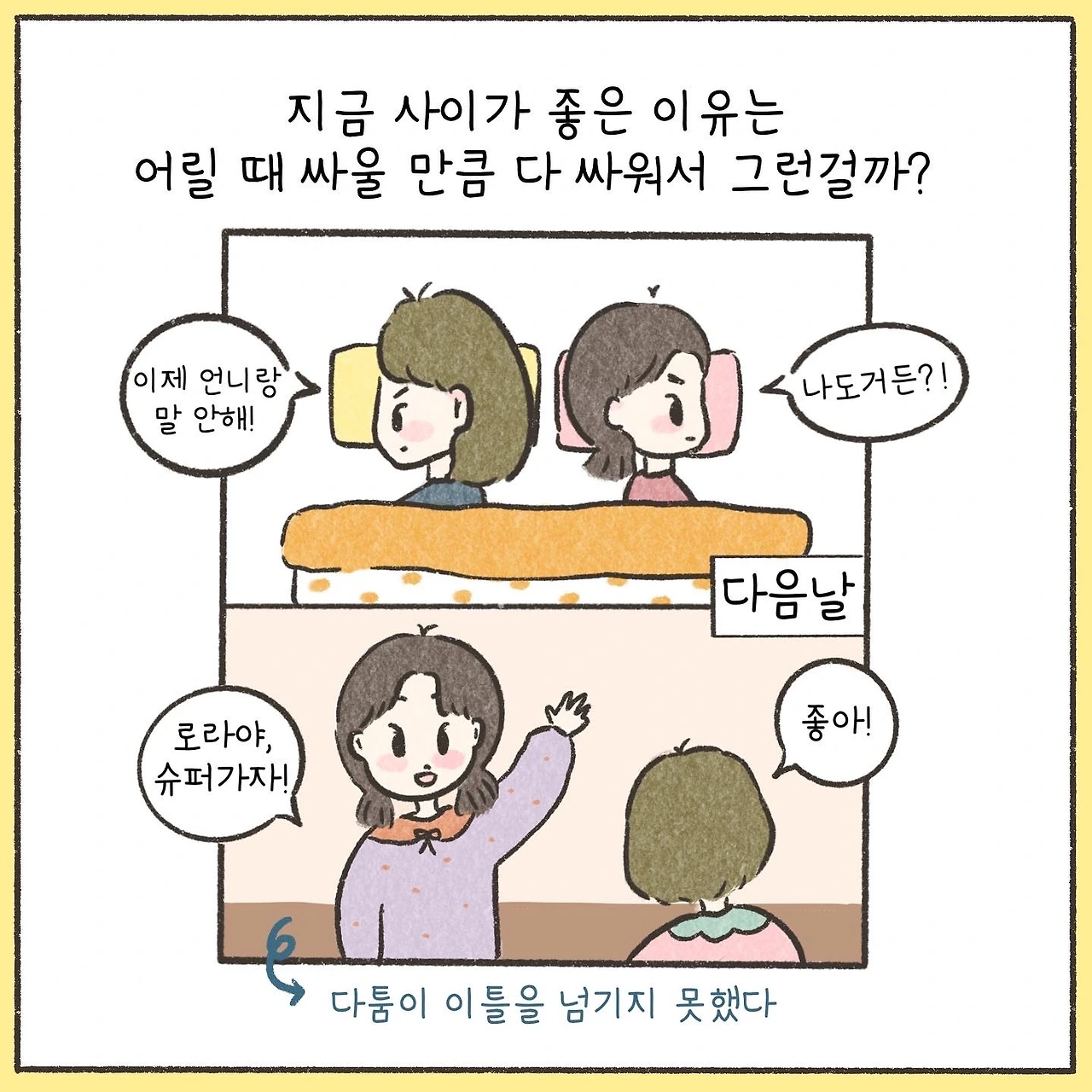 늘 동생을 ‘놀아 준다’고 생각해왔던 철없는 언니는 이제야 자신이 더 많은 것을 받았음을 깨닫는다.