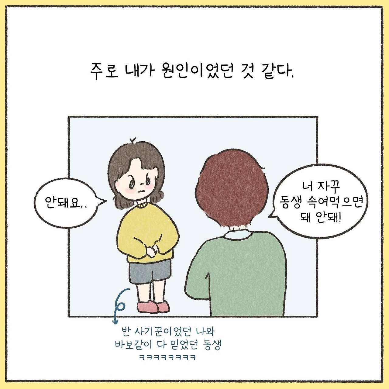 동생과 저 일기를 처음 발견했을 때 얼마나 웃었는지 모른다. 제목부터 얼굴이 화끈해지고 읽어보면 더 미안해지는 일기다. 동생의 눈에 저렇게 비쳤던 어린 시절의 나는 스스로 꽤나 괜찮은 어린이라고 생각했다. 부모님 말씀도 잘 듣고 공부도 곧잘 했으니까. 진짜 내 모습은 나보다 연약한 위치에 놓인 사람이 보는 것 같다. 다툼을 통해 인내를 배우고, 꾸지람을 통해 배려를 배우고 상처를 주고받음으로써 조금 더 나은 사람이 된다.
