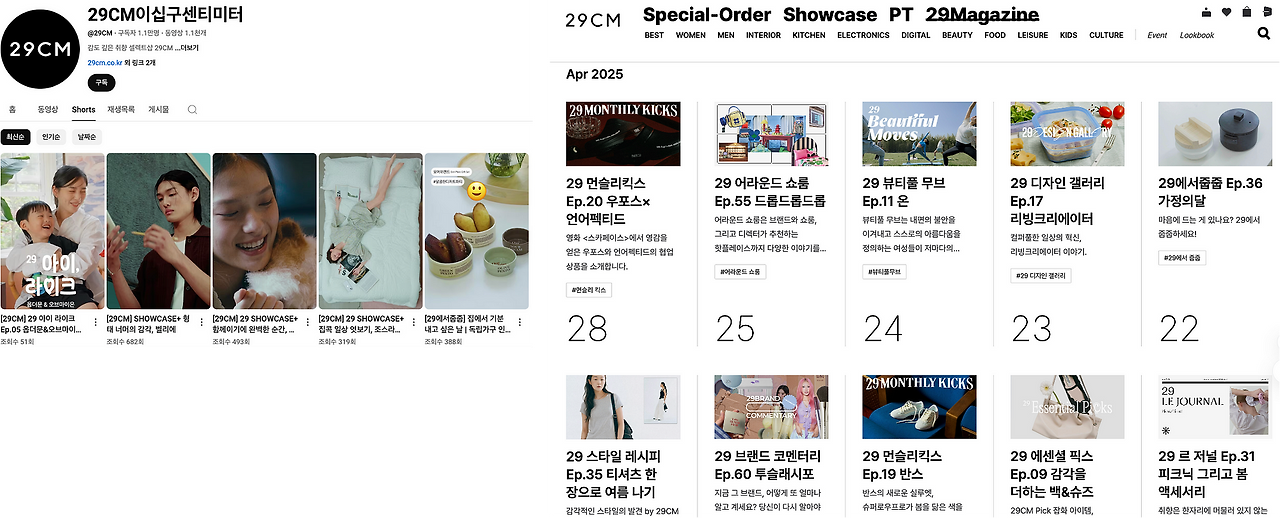 숏폼: 유튜브 쇼츠에서 ‘아이, 라이크’, ‘SHOWCASE+’, ‘29에서줍줍’ 등 감각적인 일상 콘텐츠 제공