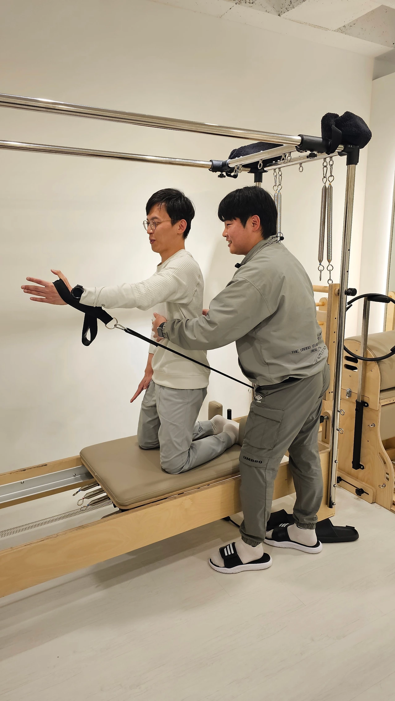 손끝으로 제 근육과 관절 상태를 체크하시는데, 매번 놀랍게도 제 목과 어깨의 ‘약점’을 정확히 짚으시더라고요. 잠시 가동술과 테라피가 이루어진 뒤, 필라테스 기구에서 몇 가지 동작을 이어가는데, 제 근육이 한결 부드러워진 게 느껴졌습니다.