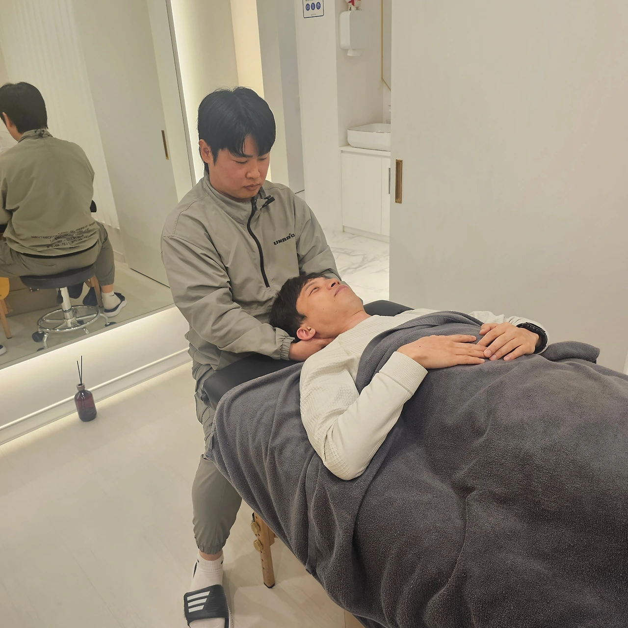 센터 한 켠에는 작은 치료실 같은 공간이 마련되어 있어, 도수치료를 받으며 불편했던 부위를 즉각적으로 점검해볼 수 있었습니다.