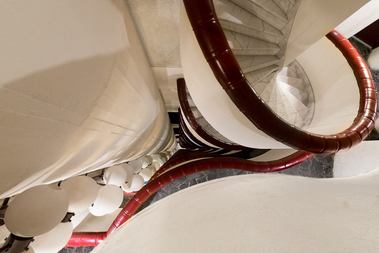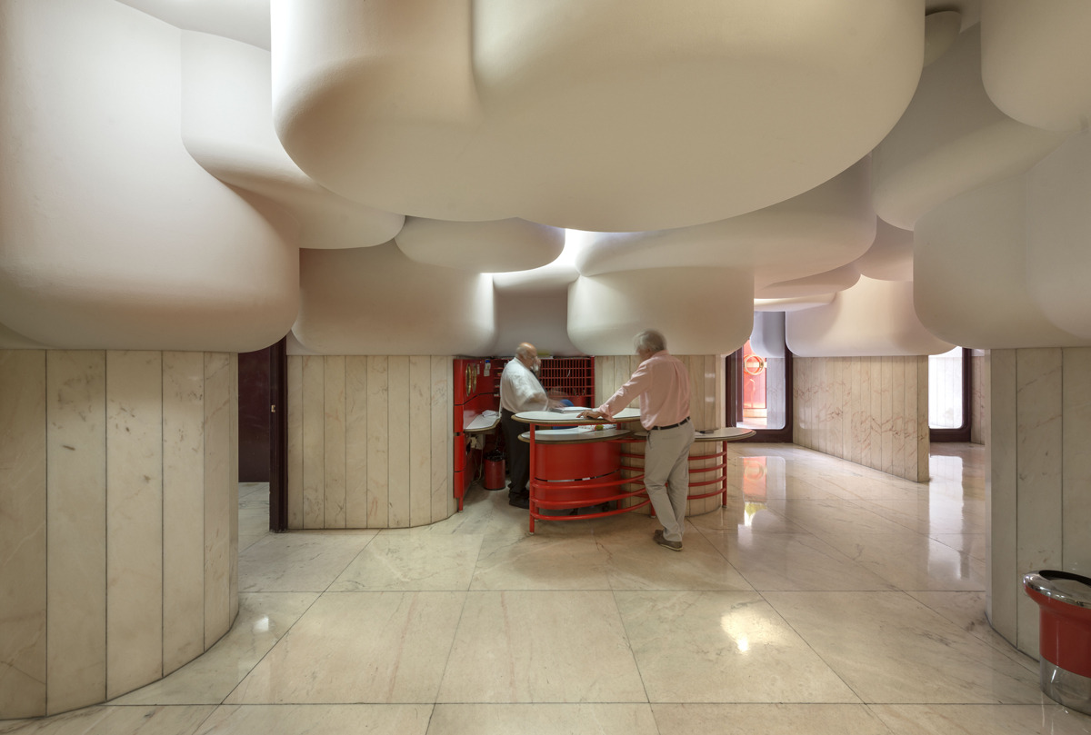 60년대 감성이 물씬 느껴지는 입구로 들어선 내부는 외관에 비하면 그 이름에 걸맞게 흰색이다. 건물의 전체적인 모티프인 둥그런 형태가 내부에서 평면에서도 계속된다. 수직 공동에 들러붙은 조명들도 어떤 포자의 군락체 같은 독특한 분위기를 만드는 데 일조한다.