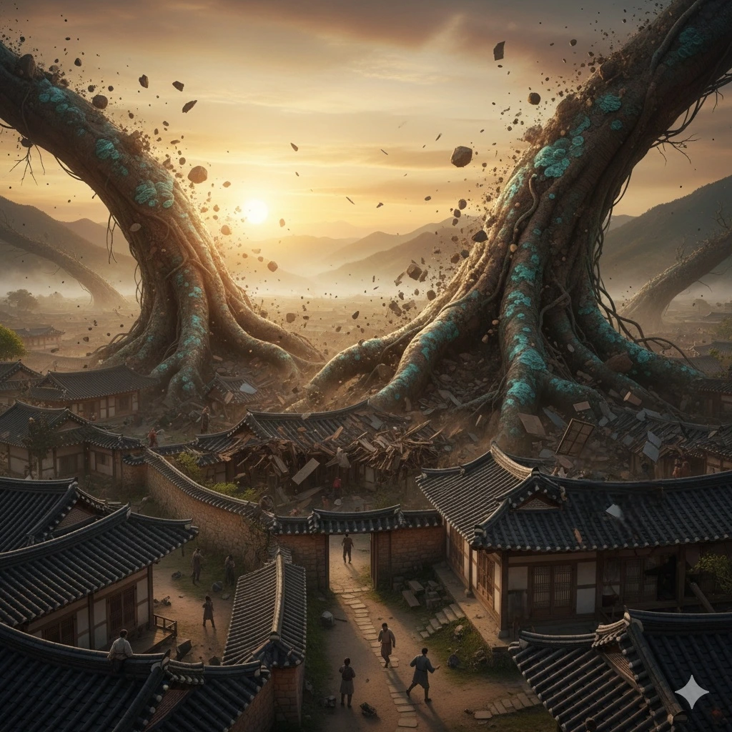 진영과 아전들은 울부짖는 호선을 에워싸고 쓰러지지 않으려 서로에게 기대었다. 그때, 거대한 나무뿌리가 흙먼지를 튀기며 땅에서 솟아 올라왔다. 뒤이어 관아 곳곳에서 뿌리들이 땅을 뚫고 올라오기 시작하였다. 관아의 전각들과 담장은 물론 백성들의 집까지 땅에서 올라오는 뿌리로 인하여 무너지고 있었다.