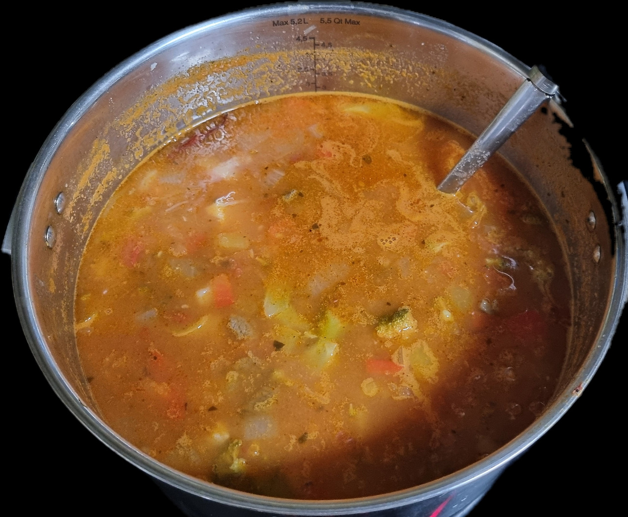 6. 페페로치노를 반으로 잘라서 넣고(파프리카 가루나 고춧가루 대체 가능) 감자와 당근이 익을 때까지 푹 끓인다. 간을 보면서 소금, 후추 등을 추가한다.