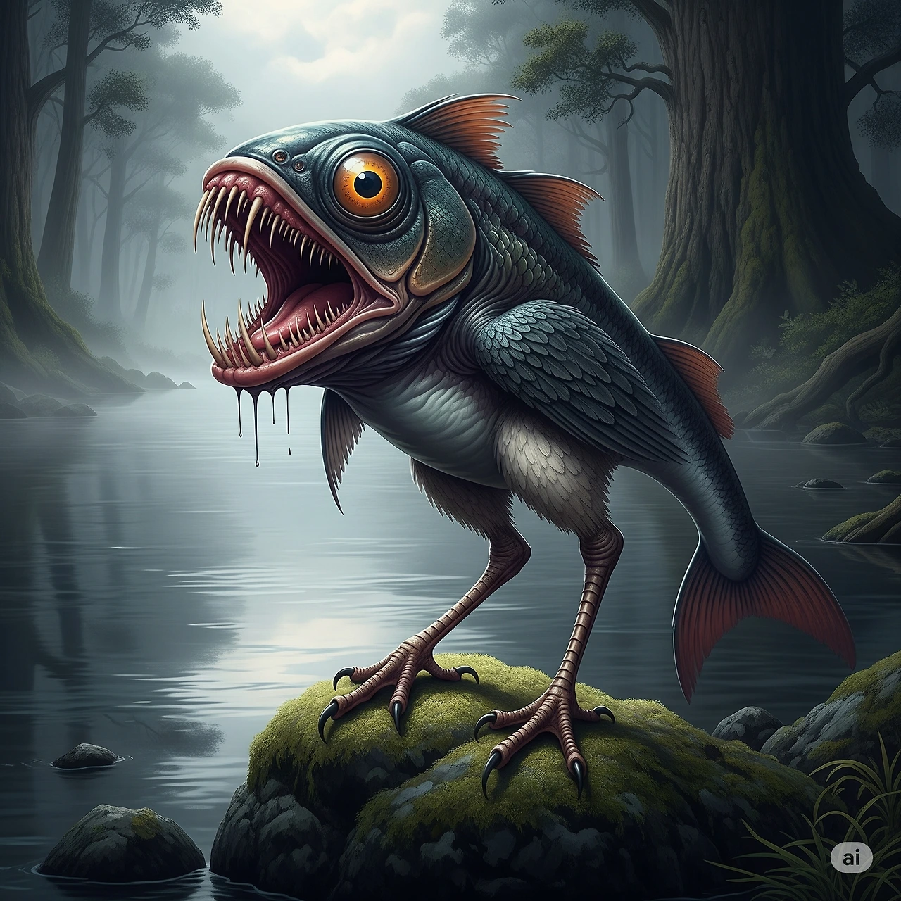그때, 무언가가 날카로운 소리를 내며 계곡물에서 튀어나왔다. 몸통에 닭의 것처럼 생긴 발이 달린 괴상한 물고기였다. 그것이 입을 벌리고 달려들자, 허월은 재빨리 몸을 돌려 피하였고 물고기는 그대로 허월이 앉아있던 바위에 머리를 박았다. 허월은 그것이 다가오는 기척을 이미 눈치채고 있었다. 공격이 빗나가자 요괴는 약이 올라 꼬챙이 같은 이빨로 바위를 사과처럼 베어 물고는 씹어 부수었다. 요괴는 물고기 같은 생김새에도 물 밖에서 숨을 쉴 수 있었는지 아가미를 뻐끔거리며 허월을 노려보았다.
