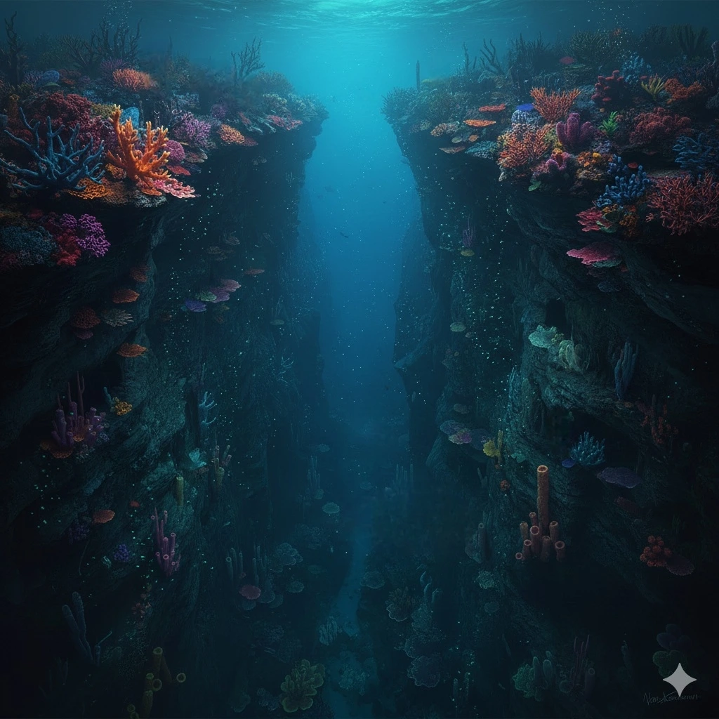 꽃밭처럼 알록달록한 산호초 너머에 햇빛이 거의 닿지 않는 어두운 골짜기가 있었다. 아무것도 살지 않을 듯한 그 깊은 골짜기가 인어들의 거주지였다. 골짜기 곳곳에 뚫린 크고 작은 굴들을 인어들이 집으로 삼아 살아가고 있는 곳이었다. 인어들은 골짜기 아래로 내려가 잡은 물고기들을 한곳에 모았다. 돌아온 친구들을 보고 인어들이 하나둘 굴에서 나와 골짜기 밑바닥으로 내려왔다.