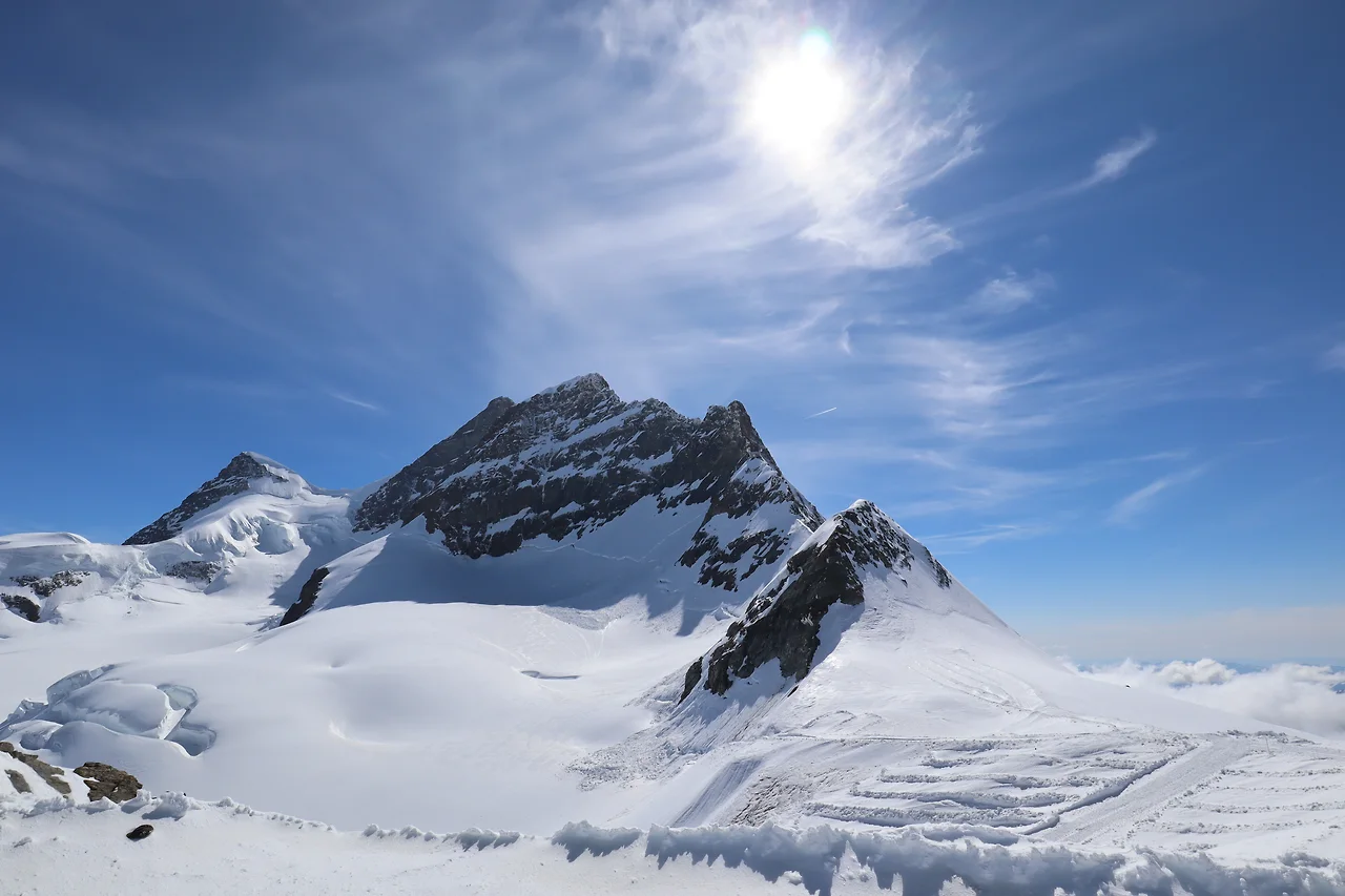 그중에서도 빙하가 가까운 알프스 체르마트나 융프라우는 한국인들이 특히 많이 찾는 곳이다. 스위스 하면 떠오르는 상징적인 이미지에 부합하는 게 알프스라서 일 것이다. 둘 중 더 많이 찾는 곳은 융프라우다. 다른 이유도 많겠지만 접근하기가 편해서다. 1912년 독립기념일에 개통한 빨간색 융프라우 기차는 상징과도 같다. 호수 사이의 동네 인터라켄에서 기차를 타고 산을 오르면 점점 경사도가 높아지는데 '세상의 지붕'이라는 융프라우요후 3454m 구간까지 타고 간다. 덕분에 우리 같은 일반인도 융프라우 4158m, 묀히 4099m, 아이거 3970m를 보다 가까이에서 보게 됐다. 심지어 그 높이에서 만년설을 발로 밟을 수도 있다.
