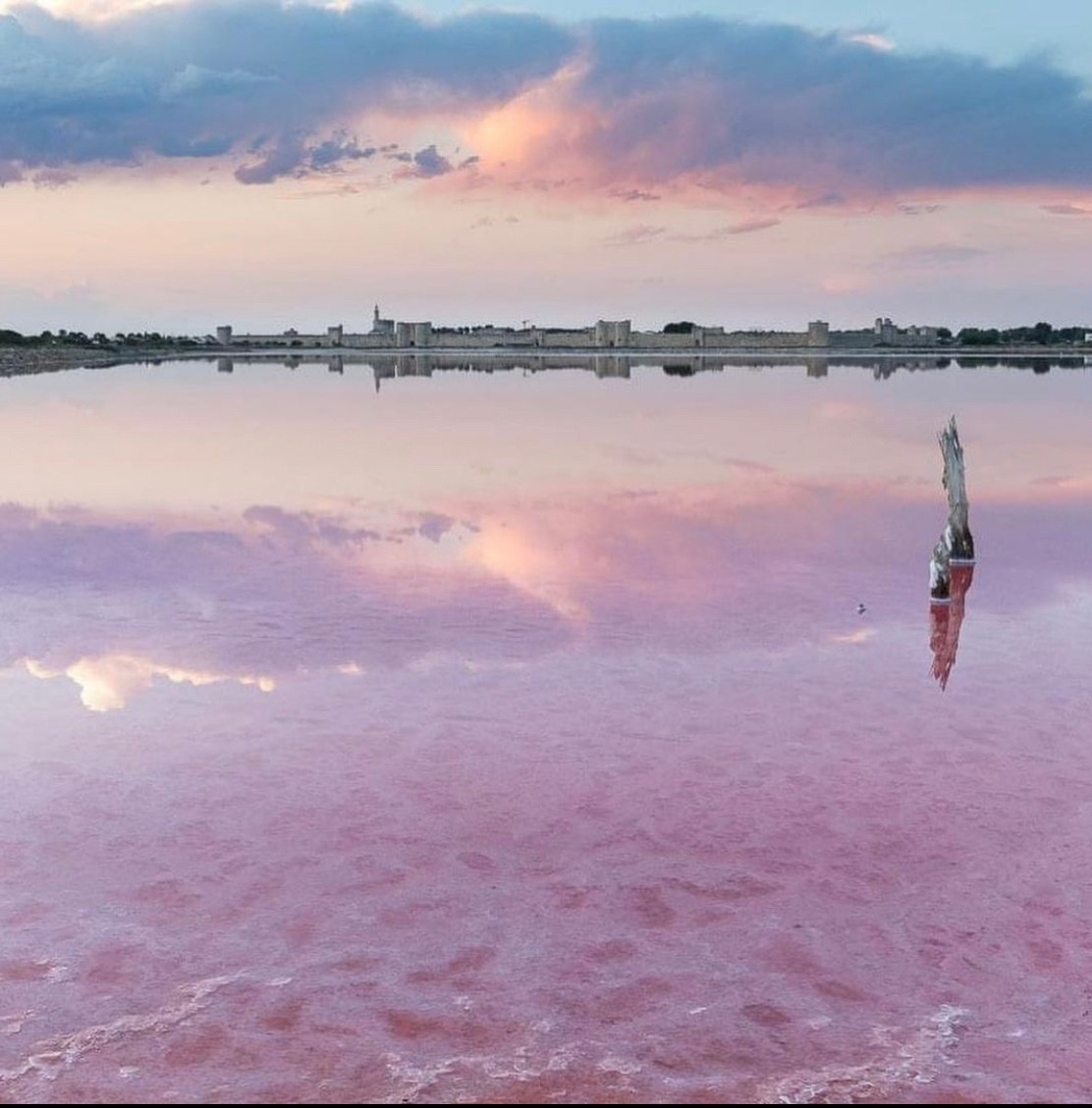 에그모르트 Aigues-Mortes는 프랑스 남부의 도시다. 고흐의 도시 아를과 몽펠리에 중간 정도에 있는 바닷가 마을이다. 성곽도시를 나와 바다 쪽으로 가면 아름다운 핑크빛 바다와 염전, 소금 언덕을 볼 수 있다. 한국에 많이 알려진 유명한 여행지는 아니지만 프랑스 현지인들은 이곳 방문을 추천한다. 풍광이 일단 독특하고 색감이 예뻐서 사진을 찍으면 모두 작품이 되기 때문이다. 바다색이 쪽빛이 아닐 수도 있구나 깨닫는 건 신선한 경험이다. 분홍 플랑크톤이 만들어내는 장관이다.