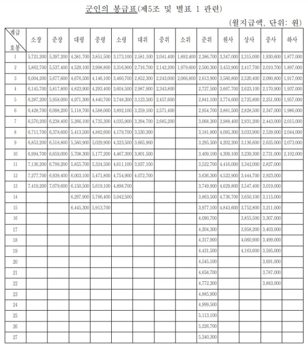 직업군인이 얼마나 많은 급여를 받는지, 전 국민이 검색 몇 번으로 알 수 있다. 그래서, 아래 표로 일반적인 급여에 대한 설명을 대체하려 한다.