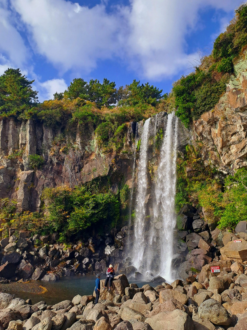 소정방 폭포 다음은 정방 폭포(입장료 2천원)이다. 폭포 가까이에 가서 사진을 찍을 수 있었으나 새 운동화여도 중심잡는 데는 젬병이므로 미끄질 수 있어서 약간 떨어진 곳에서 바라보았다. 겁쟁이라 불러도 할 수 없다. 나홀로 뚜벅이가 발목이라도 살짝 다치면 일이 꼬이므로, 위험은 가급적 줄이는 방향으로!