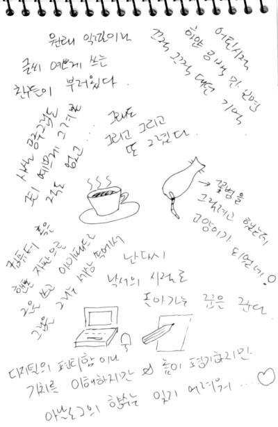 하지만 얻는 게 있으면 잃은 것도 있으니, 그게 바로 낙서하는 버릇이었다. 지금도 마찬가지이지만 컴퓨터를 접한 이래 거의 삼십년이 넘는 동안 자판만 신나게 두드렸고 손으로 무언가를 써본 적은 거의 없어서 안그래도 악필인데 더더욱 심각한 악필로 전락하고, 예쁘게 못쓰니까 손글씨를 회피하게 되고, 낙서는 아예 생각하지도 않게 되었으나 그게 큰 문제라고 생각하지 않았다. 요즘 아이들에 비하면 디지털 의존도가 낮은 셈이고, 국가차원에서 디지털 기기 사용을 적극 권장하는 상황이므로.